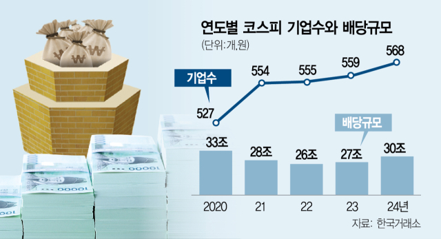 국민연금이 이처럼 배당이 자본배치 관점에서 적절하게 이뤄졌는지 들여다보는 이유는 배당을 시행하는 문화가 상당 부분 자리잡아가고 있기 때문이다. 다만 배당금 규모가 줄어든 것도 영향을 끼친 것으로 보인다. 한국거래소에 따르면 코스피 상장사 중 배당을 시행하는 기업은 2020년 527개사에 2024년 568개사로 증가했다. 반면 배당금 규모 자체는 2020년 33조 원을 기록한 이후 2022년 26조 원, 2024년에 30조 원으로 집계됐다. 배당 시행 기업은 늘었지만 배당금 규모가 줄면서 질적 평가에 나서는 것으로 풀이된다.