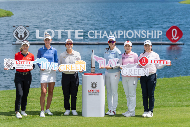 미국여자프로골프(LPGA) 투어 롯데 챔피언십(총상금 300만 달러)이 10월 2일(한국시간)부터 미국 하와이주 오하우섬 호아칼레이CC(파72)에서 열린다. 올해 13회째를 맞는 롯데 챔피언십은 LPGA 투어 중 유일하게 하와이에서 열리는 대회다. 대회 개막을 이틀 앞두고 30일 열린 포토콜 행사에 브룩 헨더슨(캐나다·왼쪽부터), 넬리 코르다, 김효주, 김아림, 최혜진, 다케다 리오(일본)가 롯데월드타워 모양으로 만들어진 우승 트로피를 배경으로 기념 촬영을 하고 있다. 사진 제공=대홍기획