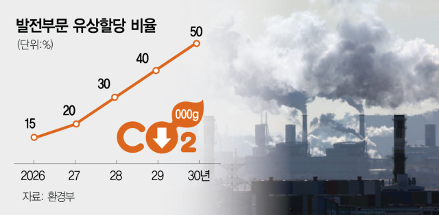 환경부는 이날 설명회에서 발전 부문 유상 할당 비율 세부안을 처음 공개했다. 유상 할당이란 정부가 배출권을 경매 형태로 기업에 유상으로 배분하는 방식이다. 이 비율이 오른 만큼 발전사의 비용 부담이 늘어나는 구조다. 이날 설명회에서 공개된 비율을 보면 내년 15%를 시작으로 2027년 20%, 2028년 30%, 2029년 40%, 2030년 50%가 적용된다. 이달 초 공개된 ‘2030년 50% 적용안’과의 차이는 2026년 비율이 20%에서 15%로 하향 조정됐다는 점이다.