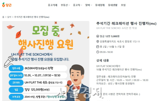 가족, 연인 단위로 축제가 곳곳에서 열릴 예정인 가운데, 이곳에서도 단기 알바를 찾는 글이 다수 발견됐다. 강원도 속초에서는 "일급 12만 5000원"에 연휴 기간 민속놀이 레크레이션 진행을 맡을 진행자를 구한다는 이색 알바 글이 올라왔다. 공주백제축제 현장에서는 "시급 1만2000원"에 푸드트럭을 함께 운영할 알바를 모집하기도 했다. 제주 서귀포 중문에서는 "시급 1만1000원"에 식물원에서 베이커리 판매 부스를 운영할 단기 스태프를 모집했고, 제주 조천읍 한 유원지에서는 오리배 탑승 수상안전요원을 모집하기도 했다.