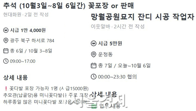 연휴 기간동안 발길이 이어질 공원묘지 앞 추모관에서 하루종일 꽃다발 포장을 할 단기 알바를 모집하는 글도 있었고, 한 공원묘지에서는 성묘객을 위해 잔디 시공을 도와 줄 단기 알바생을 모집하기도 했다. 이밖에도 유리창 청소 알바, 호텔 청소 알바, 식당 주방 보조 알바 등 다양한 단기 알바 모집글을 확인할 수 있었다.