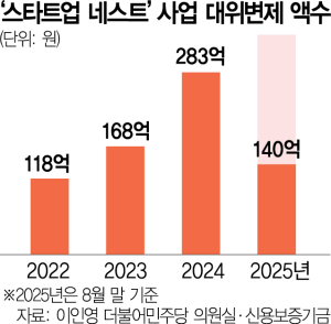 30일 이인영 더불어민주당 의원실에 따르면 신보가 ‘스타트업 네스트’ 사업을 통해 대출을 대신 갚아준 대위변제 규모는 2020년 30억 원에서 지난해 283억 원으로 5년 새 10배 가까이 급증했다. 올해 들어서도 8월까지 이미 140억 원에 달해 증가세는 꺾이지 않고 있다.