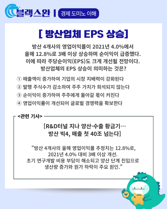 ■ 방산 호황: 국내 4대 방위산업 기업 매출 총액이 처음으로 40조 원을 넘어서며 방산 황금기가 본격화됐다. 해외 수출이 급증하면서 영업이익률이 2021년 4.0%에서 올해 12.8%로 폭증했으며, 수주 잔액도 103조 4700억 원으로 사상 처음 100조 원을 돌파하는 쾌거를 이뤘다. 한편 사우디아라비아, 루마니아, 폴란드 등지에서 추가 수주 기대감도 고조되는 양상이다.