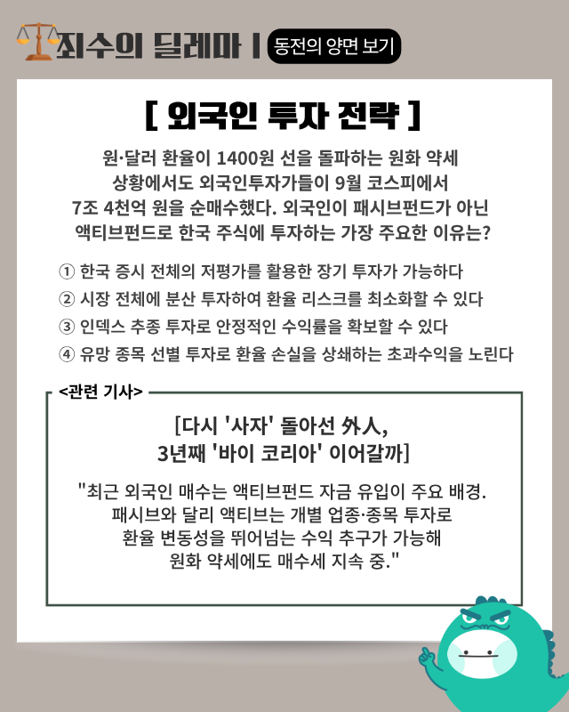 - 핵심 요약: 외국인투자가들이 9월 코스피 시장에서 총 7조 4373억 원을 순매수하며 3년 연속 ‘바이 코리아’ 가능성이 고개를 들고 있다. 본격적인 금리 인하 사이클에 접어들고 정책 모멘텀이 되살아나면서 9월 한 달 동안 6거래일을 제외하고 모두 매수 우위를 보였다. 특히 삼성전자(005930)와 SK하이닉스(000660)에 각각 4조 9272억 원, 1조 3660억 원이 집중되었으며, 외국인의 코스피 시장 지분율도 34.04%까지 높아졌다. 주목할 점은 원·달러 환율이 1400원 선을 다시 돌파하는 원화 약세에도 불구하고 외국인이 대규모 매수세를 보였다는 것으로, 액티브펀드 자금이 유입된 영향이 큰 것으로 분석되는 상황이다.